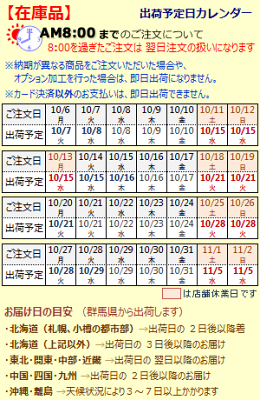 複数の商品をご注文頂いた場合などは遅い方の納期に合わせて出荷しますので商品ごとのカレンダーと、出荷日が異なる場合があります。