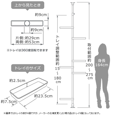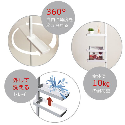 サイズ 全体/約幅(片側)29/(両側)53/×奥行9×高さ200〜275cm トレイ内寸/約幅23.5×奥行7.5×高さ2.5cm 重量 約2.3kg 耐荷重 各トレイ/約2kg 全体/約10kg 材質 パイプ/スチール、塗装仕上 結合部など/ABS樹脂 ゴム/天然ゴム、合成ゴム バネ・ネジ類/スチール(メッキ)、ABS樹脂 製造国 中国 突っ張り ハンガー 突っ張り棚 つっぱり つっぱりポール 棚 ラック つっぱり棒強力 つっぱりポールハンガー ハンガーラック つっぱり棒 つっぱり ハンガー 玄関収納 北欧 おしゃれシンプルデザイン つっぱり式 スリムラック 洗面台、玄関、浴室、トイレ、洗濯機周りなど、家の中にはちょっとしたスキマが思った以上にたくさんあります。