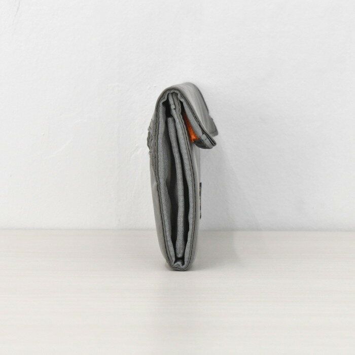サイズ:W19.5 H10.5 D2.5cm 素材:(表)ナイロンツイルポリエステル綿ボンディング加工(MA-1タイプ)、(裏)ナイロンタフタシレー加工 重量:約125g 内容:背面ファスナーポケット1(W19 H7cm)、カードポケット6+4、札入れ2、仕切りポケット1、内部ファスナーポケット1、保存用巾着袋 メーカー品番:NO.622-68166 2010年(AW)追加 日本製 カラー:シルバーグレー ※モデルの身長は女性160cm、男性170cmです。